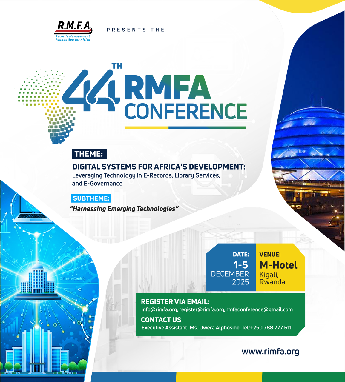 Join us in Kigali, Rwanda, “the Land of a Thousand Hills,” for the 44th RMFA International Conference offering an unparalleled experience. The “Digital Systems for Africa’s Development” conference will explore how emerging technologies can revolutionize records management, e-governance, and library services across the continent. This is a must-attend event for professionals seeking to leverage the power of technology to drive efficiency and innovation. Secure your place at the forefront of Africa’s digital transformation and network with leading experts and peers. Register today to be part of shaping a more digitally connected and governed Africa.